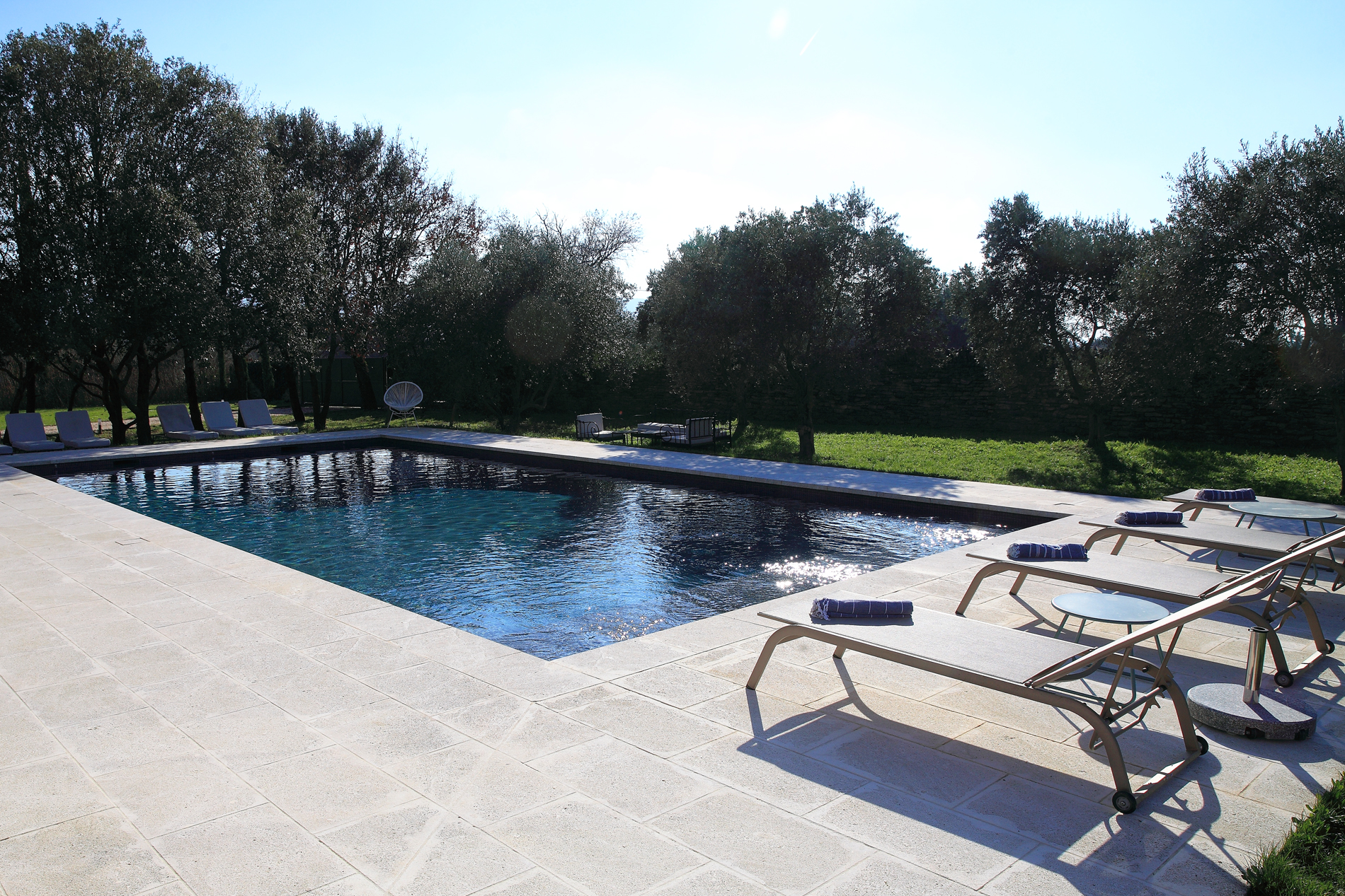 La piscine chauffée de 12 x 6 mètres, équipée d’un volet électrique pour la sécurité, est entourée de chaises longues confortables, installées au milieu de la pinède pour un cadre naturel et reposant. Avec ses deux terrasses la maison offre deux lieux pour prendre ses