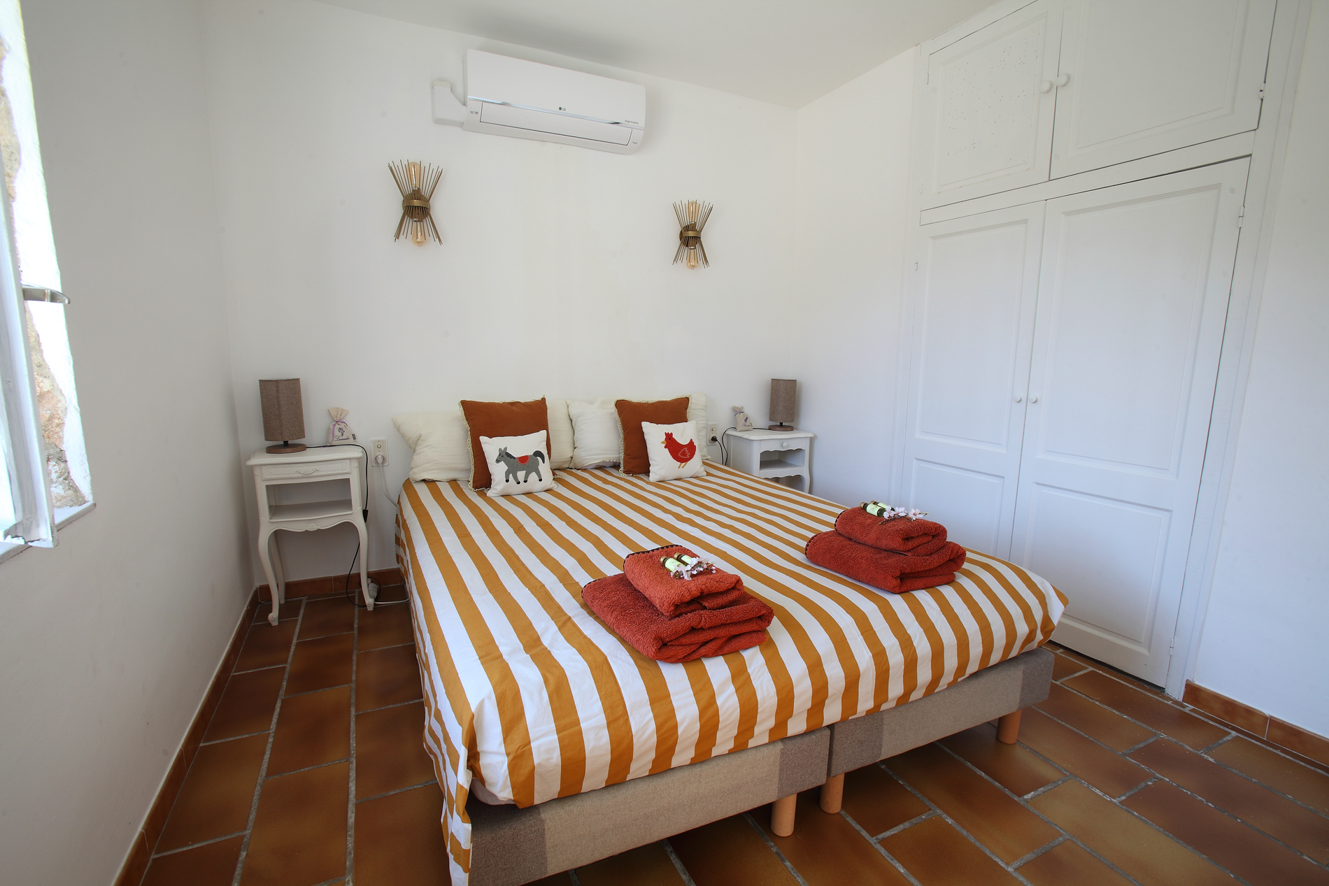 - Chambre 3 : lit queen size (160 x 200) ou deux lits simples (80 x 200), avec deux lits superposés pour enfants.