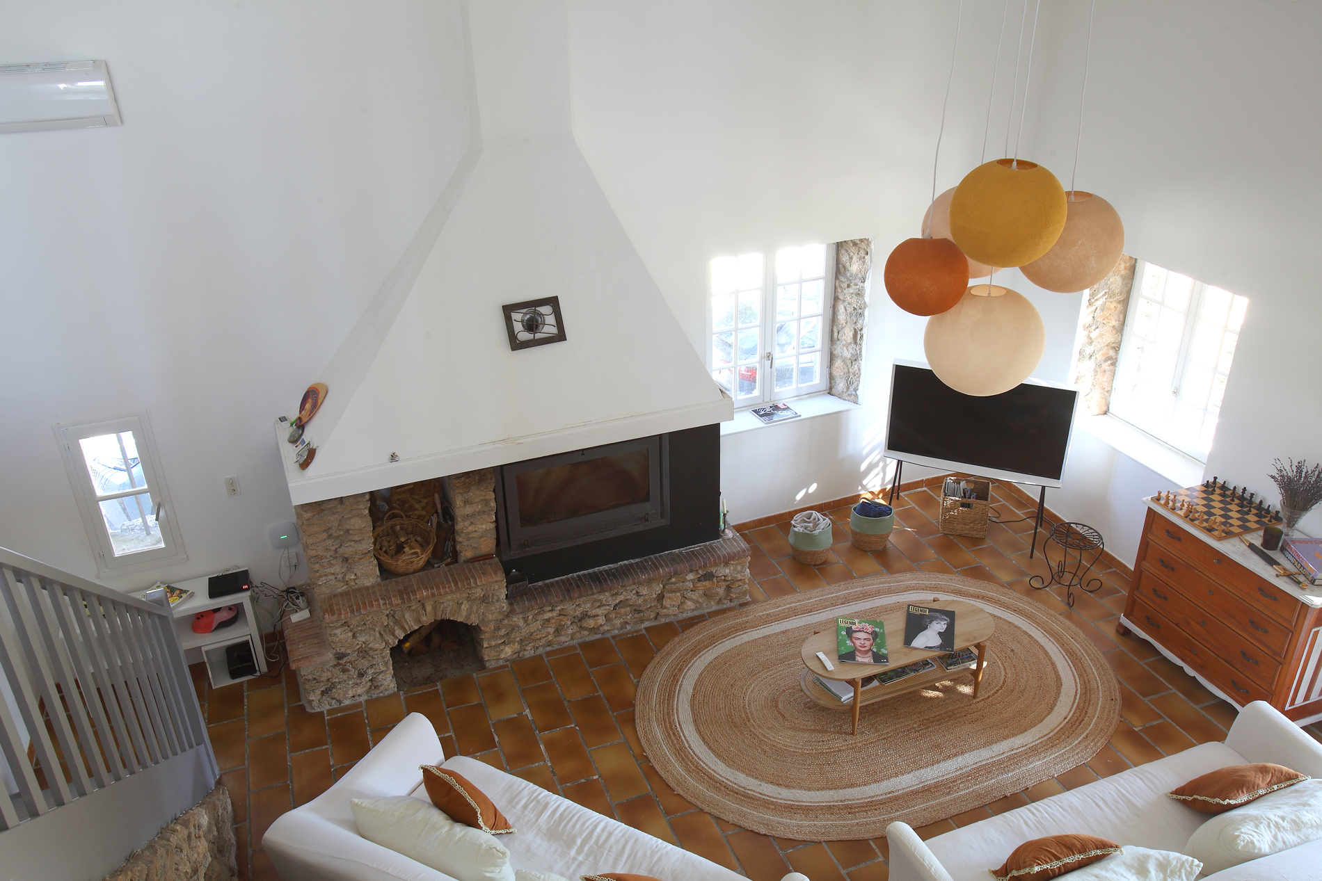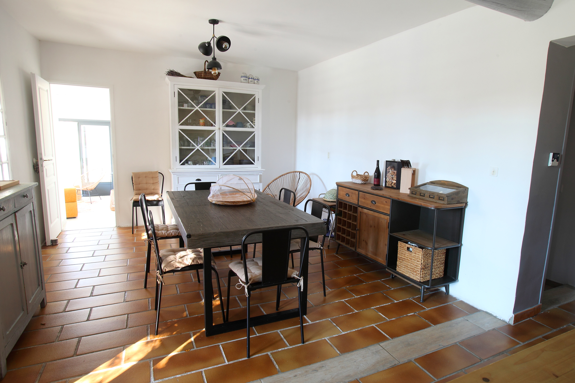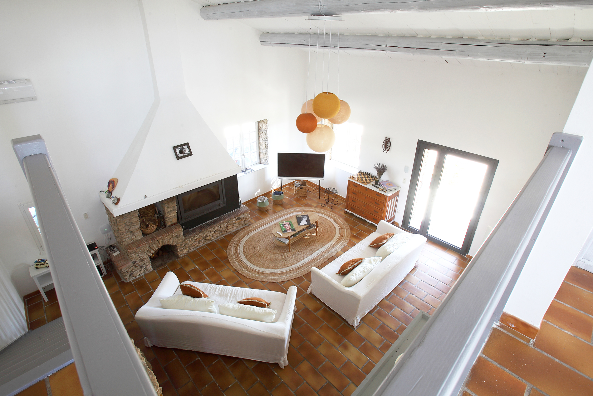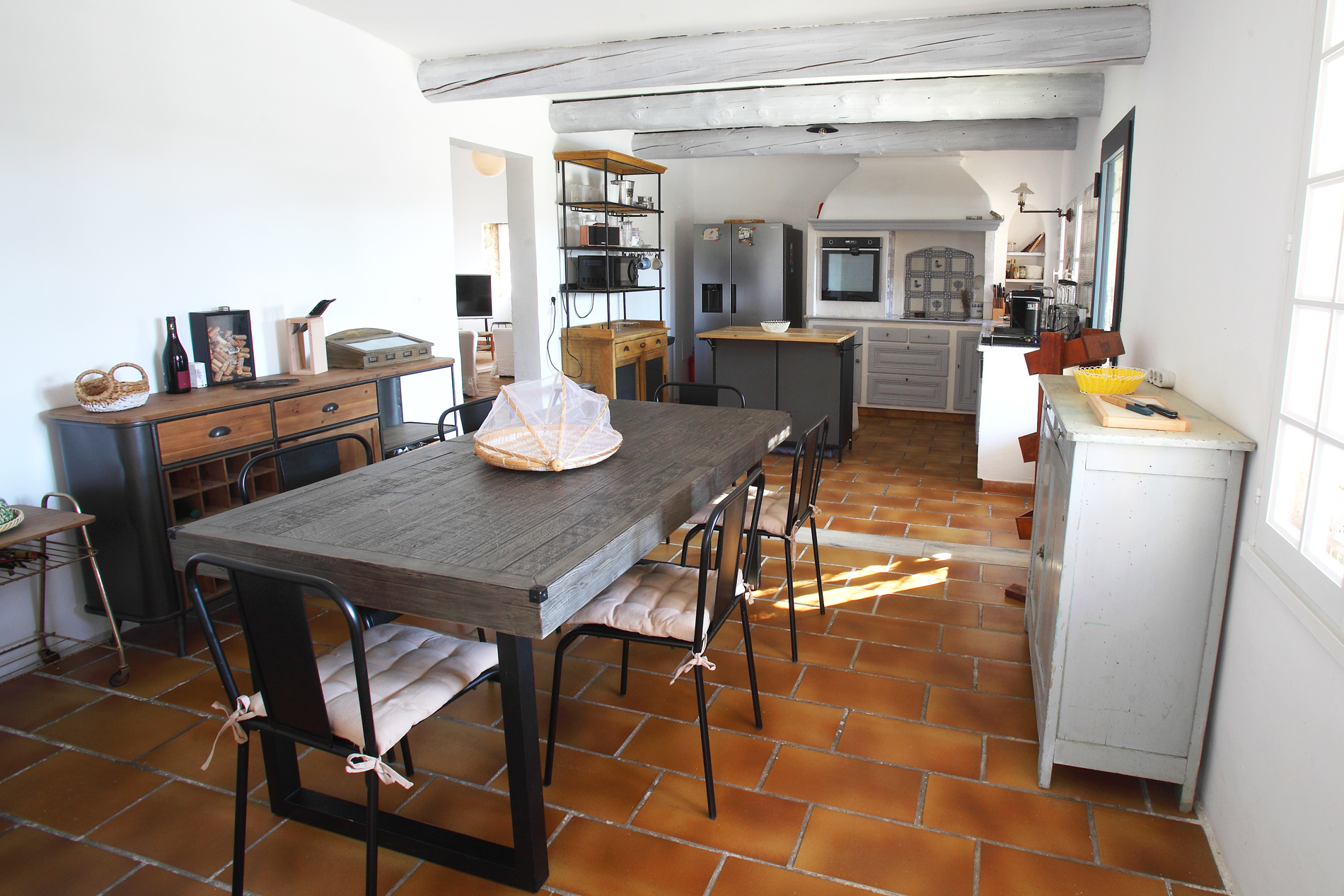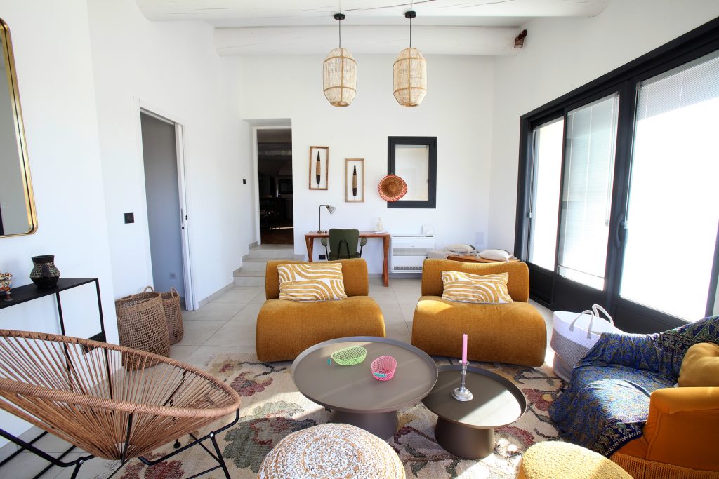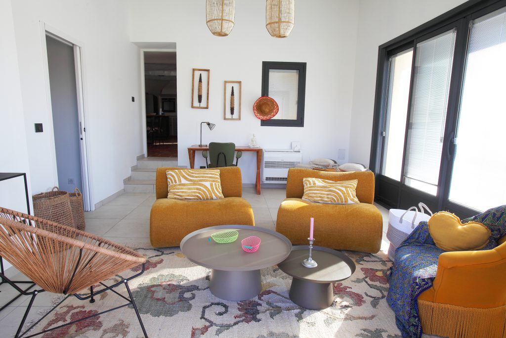 L’intérieur a été conçu pour favoriser la détente et les moments partagés. L’espace de vie principal comprend une cuisine entièrement équipée ouverte sur un vaste salon avec télévision, parfait pour se retrouver en famille. Un second salon lumineux s’ouvre directement sur la piscine, facilitant l’accès aux extérieurs.