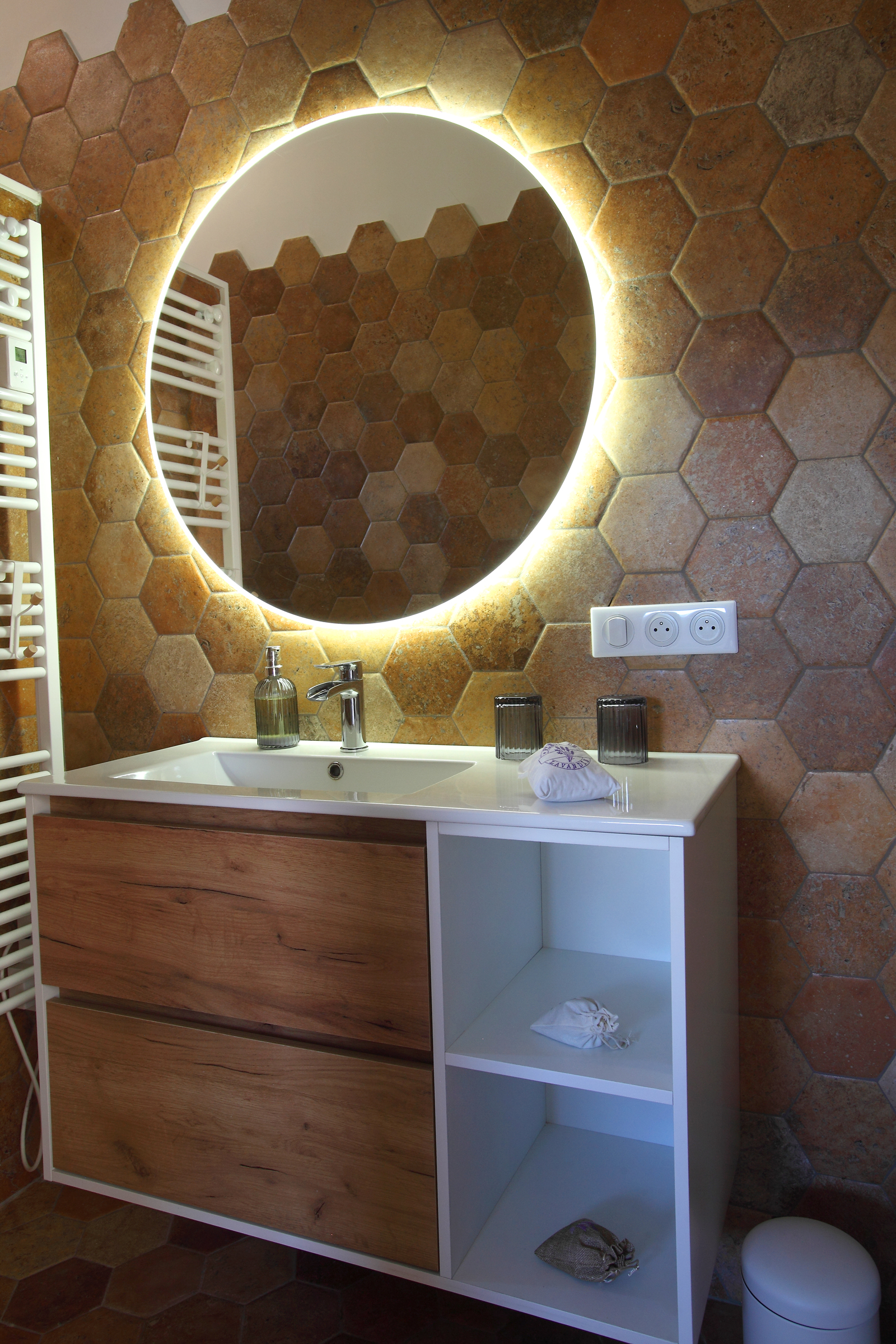 - Chambre 1 (rez-de-chaussée inférieur) : lit queen size (160 x 200) et salle d’eau privative avec douche, lavabo et WC.